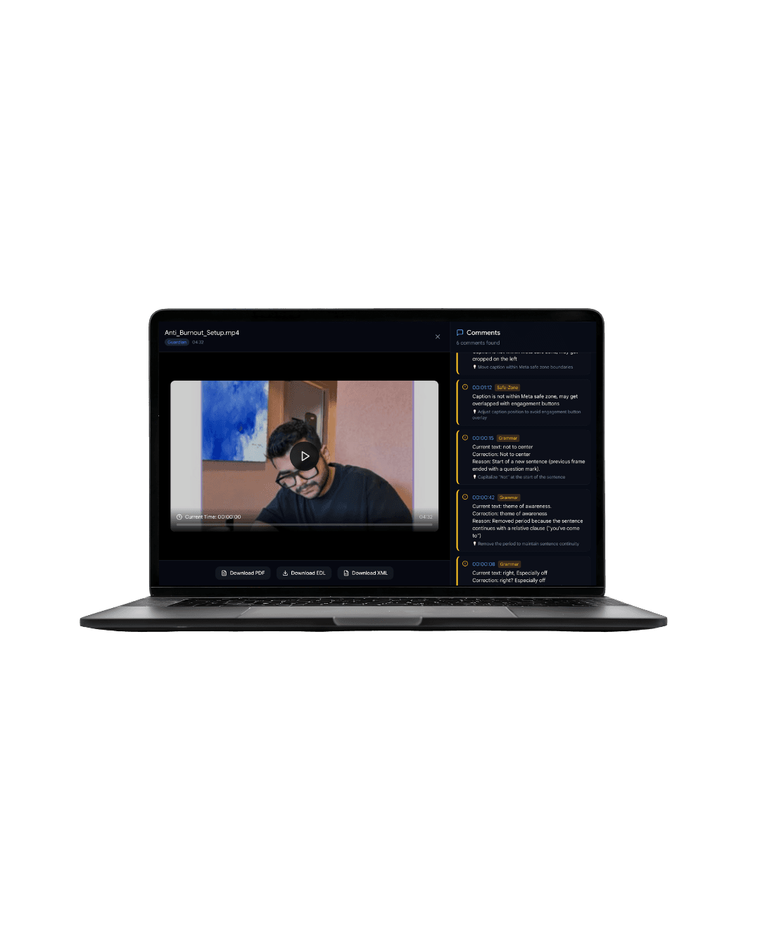 Receive a timestamped list of "Red Flags" in minutes. Review the findings in a clean PDF or export markers directly into Premiere Pro or DaVinci Resolve to resolve every issue instantly.